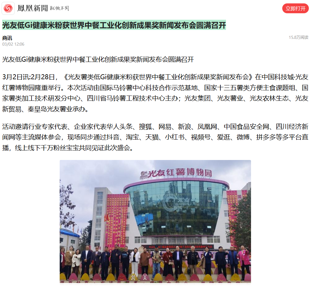 光友低Gi健康米粉獲世界中餐工業(yè)化創(chuàng)新成果獎(jiǎng)新聞發(fā)布會(huì)圓滿(mǎn)召開(kāi)https://ishare.ifeng.com/c/s/8rA9R8r7LEH